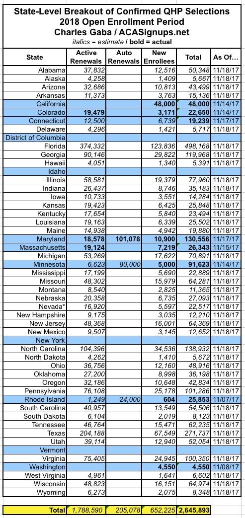 In any event, here's my best estimate of the state-level breakout of new enrollees vs. renewals, including the known data from the 12 state-based exchanges: