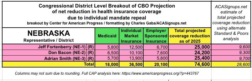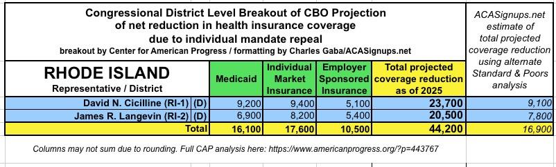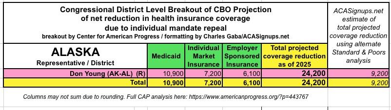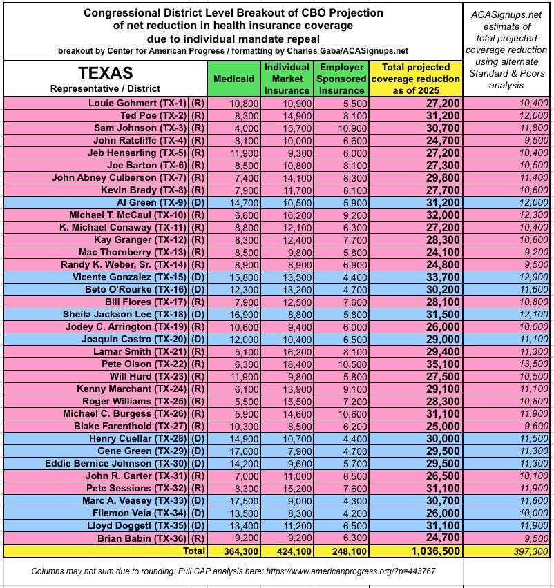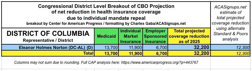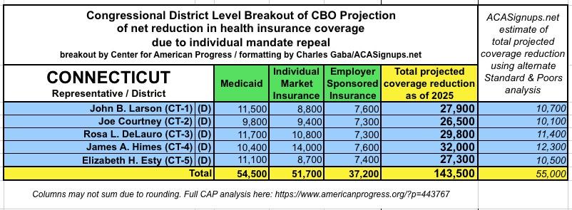 One more thing, however: In addition to the Congressional Budget Office projections, I've also included my own CD-level breakout of the lower coverage loss projections estimated by Standard & Poors. Unlike the CBO's 13 million projection, S&P estimates that only around 5 million people at most would lose coverage over the next several years if the ACA's individual mandate were to be repealed (without other significant changes to the law).