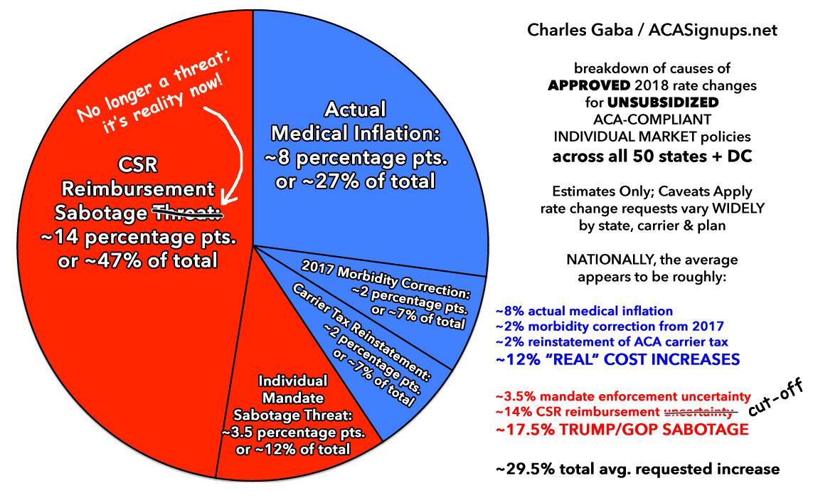 Oh yes, that's right... almost exactly 60% of the average unsubsidized national rate hikes on the individual market this year were caused specifically by deliberate sabotage by Donald Trump and (to a lesser extent) Congressional Republicans, mostly in the form of cutting off CSR reimbursement payments and threatening to repeal the Individual Mandate (which, of course, they actually followed through on in December).