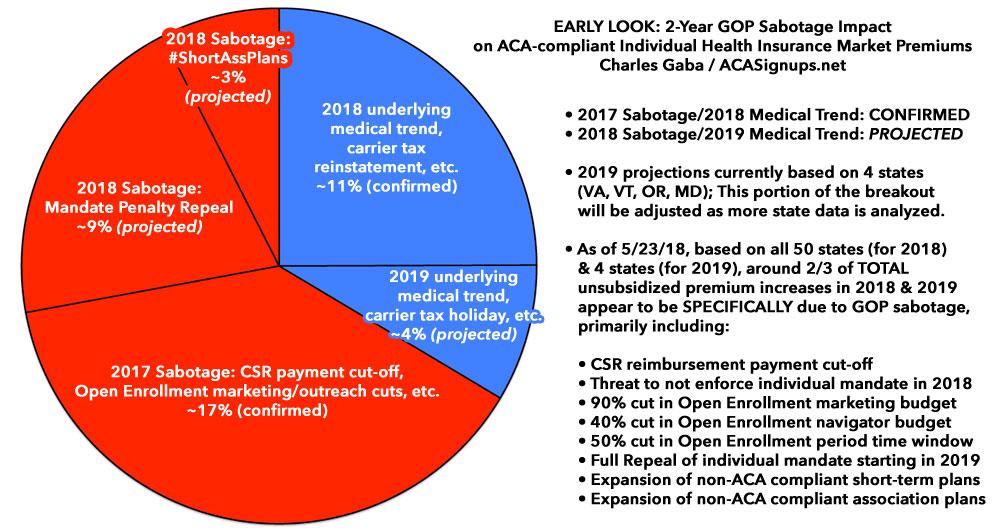 And how much is "most"? Well, last year I accurately estimated that around 60% of the overall ~29% average unsubsidized premium increases for 2018 were caused specifically by GOP sabotage. For 2019, it's still very early, of course, but at the moment it's looking like the overall increase will be smaller (I have it pegged at 16% so far based on the first 4 states), but the portion of that increase caused by sabotage appears to be larger: Around 3/4 of it. Based on that, here's a rough breakout of the influence of both 2017 and 2018 sabotage on 2019 premium increases (I've pretty much confirmed the 2018 breakout; the 2019 projected breakout is based on the 4 states I've already analyzed, influenced by the Urban Institute projections above):