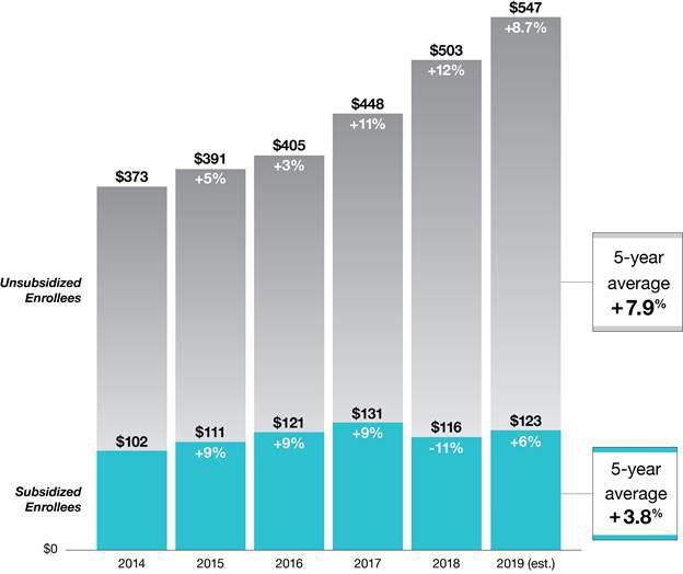 The historic gains made through steady enrollment have helped keep Covered California’s premiums at a stable level. Over the past five years, Covered California has held actual average annual rate changes for unsubsidized consumers to an estimated average of 7.9 percent and 3.8 percent for subsidized consumers (see Figure 1: California’s Individual Market Premiums).