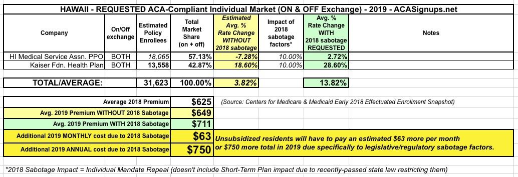 Hawaii: Preliminary 2019 #ACA rate hikes: 13.8%, but would likely be ~3.8% w/out #ACASabotage
