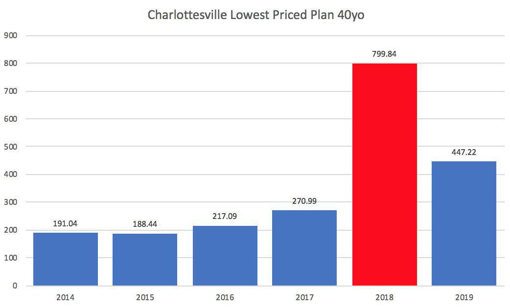 Assuming Anthem's 2019 are approved, here's how #Charlottesville premiums look year to year. That's @sentarahealth Optima in the red, and what they did to consumers when they got a monopoly for a year. Every last detail of how this happened will be exposed.