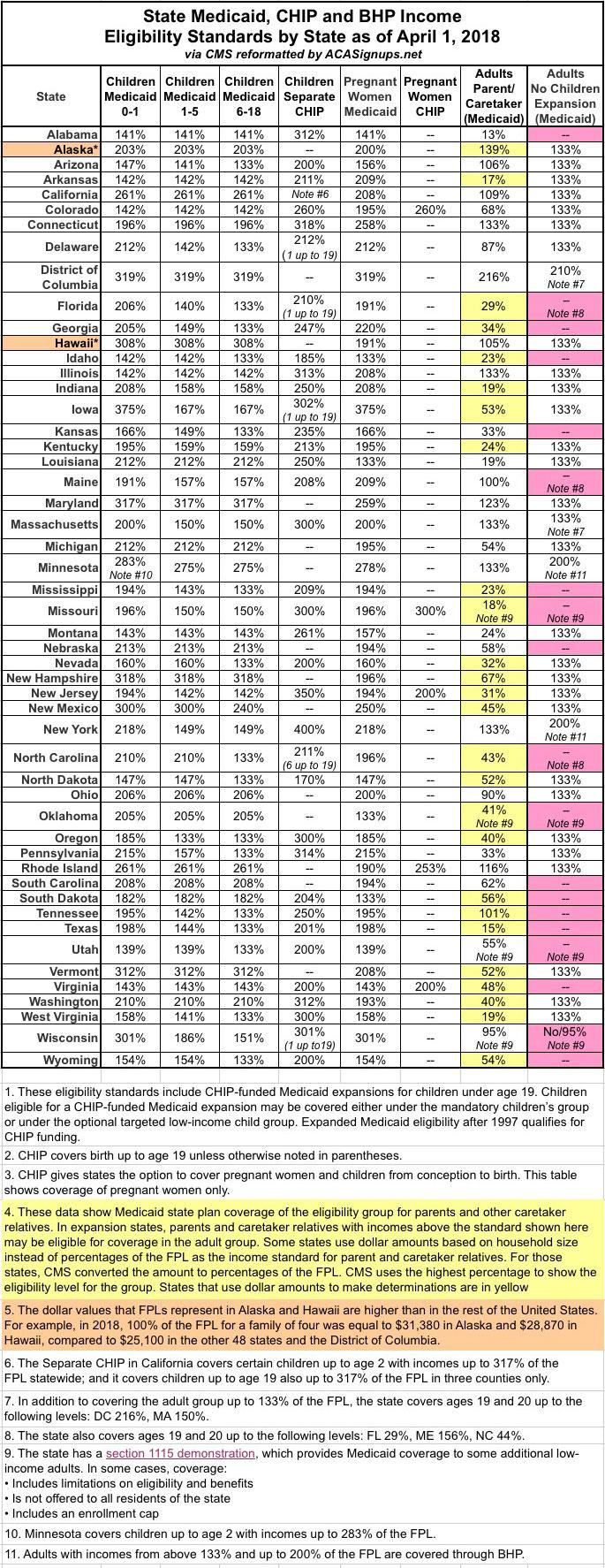 A few years back I posted an entry which breaks out the income eligibility thresholds for Medicaid and CHIP in every state. I've reposted an updated version below, which also takes into account Basic Health Plan (BHP) eligibility in Minnesota and New York. This comes directly from the Centers for Medicare & Medicaid. Note the footnotes at the bottom. The pink cells on the right indicate that the state has not yet expanded Medicaid under the ACA (Maine and Virginia have passed but note implemented doing so, while Medicaid expansion is on the ballot in Idaho, Nebraska and Utah this November).