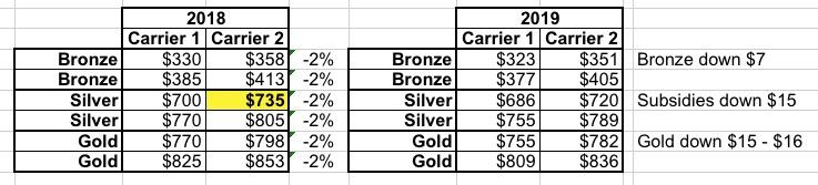 As you can see, if the subsidized enrollee chose a Gold plan in 2018, they'll likely pay almost exactly the same in 2019 as well...their net premium may even drop a buck or two more per month. However, if they chose a Bronze plan, they'll pay around $8 more per month, since their subsidies dropped by more than their premium did. Annoying, but not devastating.