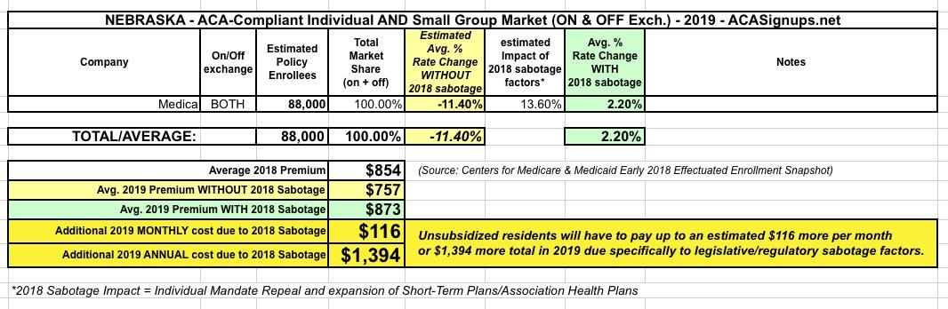 So...Nebraska is among the very rare states where I have to increase their 2019 average rate change more than I previously had it pegged at. Fortunately, it's only increasing from 1% to 2.2%. Unfortunately, the mandate repeal + #ShortAssPlans expansion still means unsubsidized enrollees will have to pay over $1,000 more next year than they'd otherwise have to.