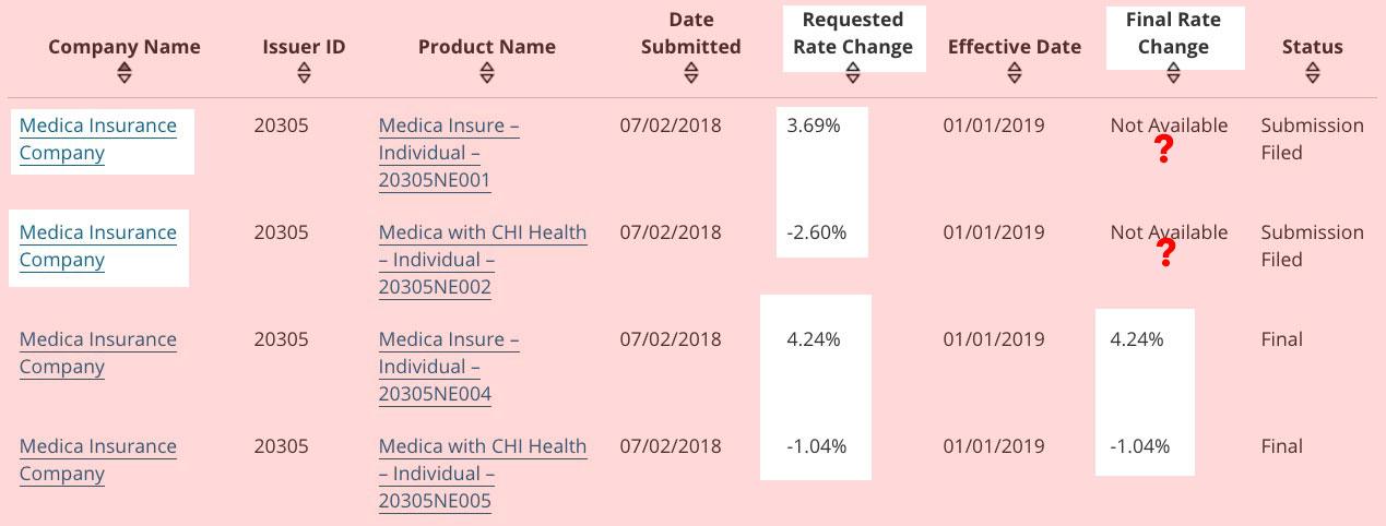 Nebraska has a slightly confusing siutation, which is surprising since Medica is the only carrier offering ACA policies in the state, When I first took a look at the requested premium changes for 2019 back in August, it looked like the average was around 1.0%...that was based on splitting the difference between the 3.69% and -2.60% listings, since the filing form was redacted and I didn't know what the relative market split was between Medica's product lines.