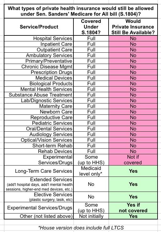 I included "other" since there might be some things I've missed, but I think this includes everything. So yes, there would be a market for what I'm gonna call the "Three E's": Elective services, extended services which go beyond whatever limits Bernie-MFA would impose (if any?), and Experimental treatments or medications. In addition, there might still be a market for Long-Term Services & Support (LTSS), although that depends on whether the final version passed into law used the Senate version (S.1804) or the House version (which does include LTSS coverage, as I understand it).