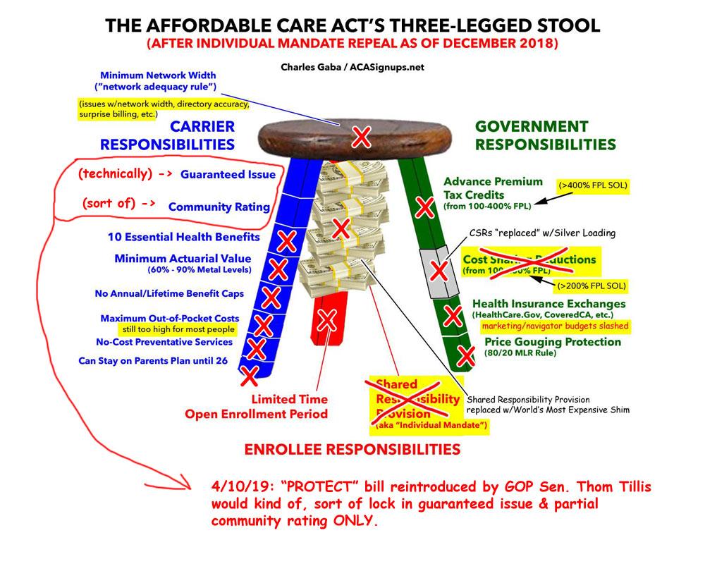 The revised version supposedly checks off the Community Rating and Essential Health Benefits parts of the Three-Legged Stool's Blue Leg, but until I see the text let's just say I'm more than a little suspicious. Even if that's the case, it would still be missing the rest of the blue leg (miniumum actuarial value, prohibition on annual/lifetime claims caps, limit on out-of-pocket expenses and so on).