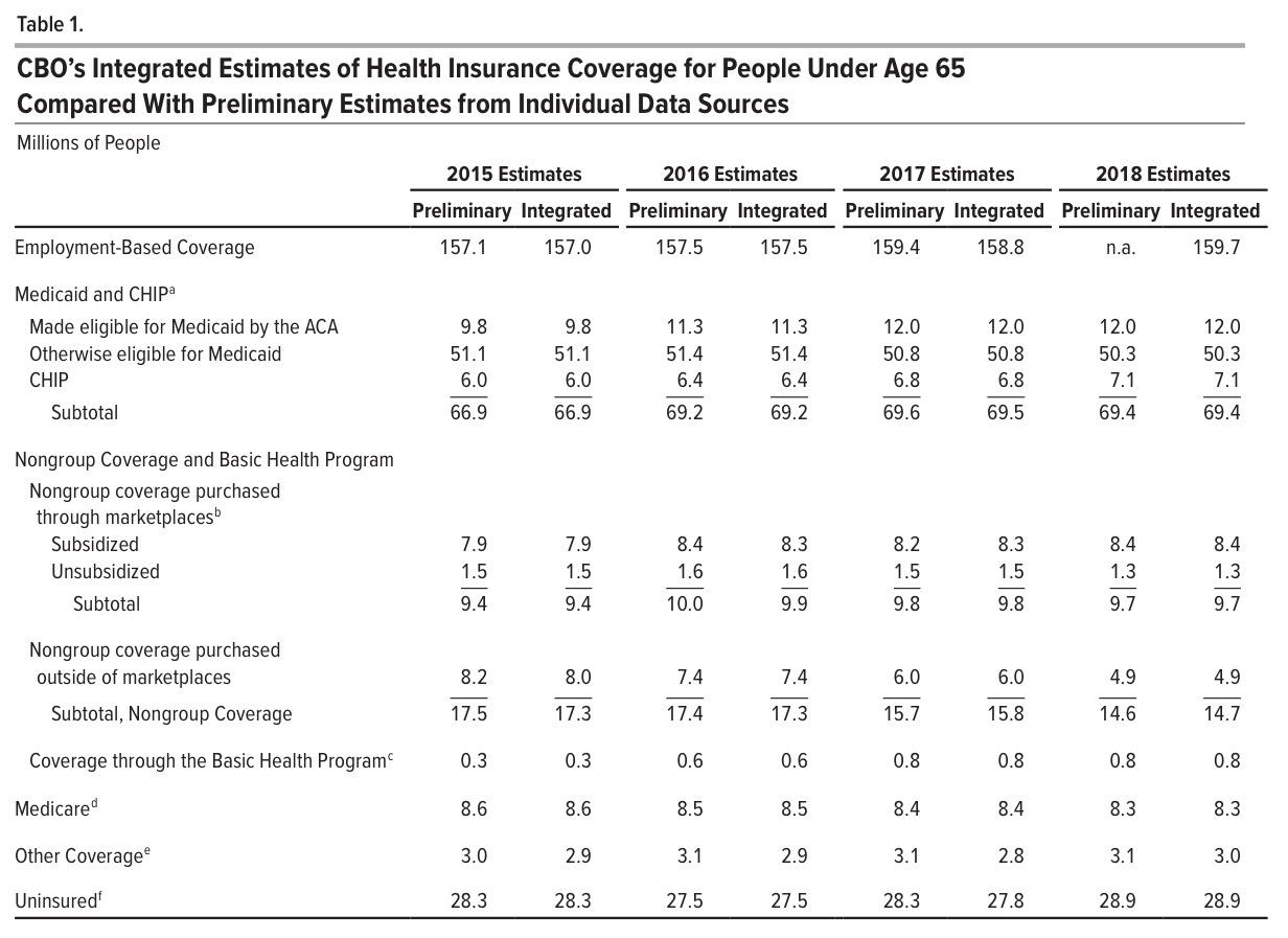 I'm a little late to the party on this one, but a week or so ago, the Congressional Budget Office released their own report breaking out estimates of just how many Americans have different types of major helathcare coverage (public or private) for each of the past four years (2015 - 2018).
