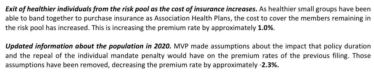Last fall it looked like the ACASabotage Trifecta of 2018--repeal of the individual mandate, expansion of short-term plans (STLDs) and expansion of association health plans (AHPs)--was responsible for around 4.4 points of the 2019 increase. For 2020, it looks like both carriers are walking back some of that...BCBS is saying only about 0.5 points and 1.4 points of their request is mandate- or AHP-related; they don't mention short-term plans at all. MVP, meanwhile, is pegging 1.0 points of their increase on the expansion of AHPs, but says they overshot their projections for mandate repeal by 2.3 points.