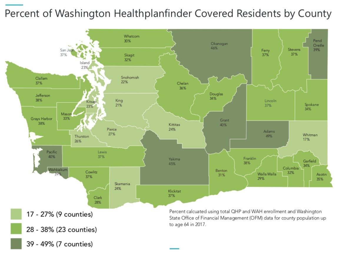 • There are 5 counties that have 40% or more of their population covered by Washington Healthplanfinder (Adams, Okanogan, Yakima, Grant, and Pacific)