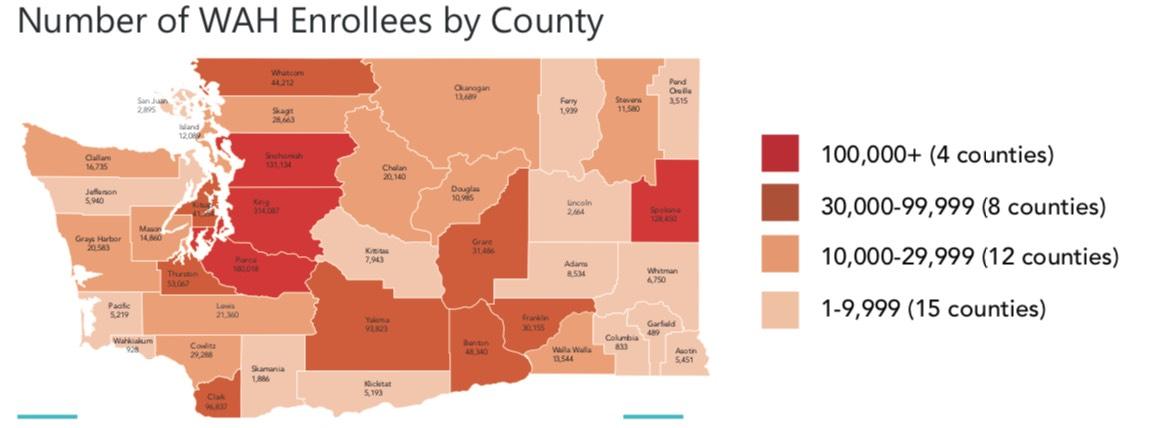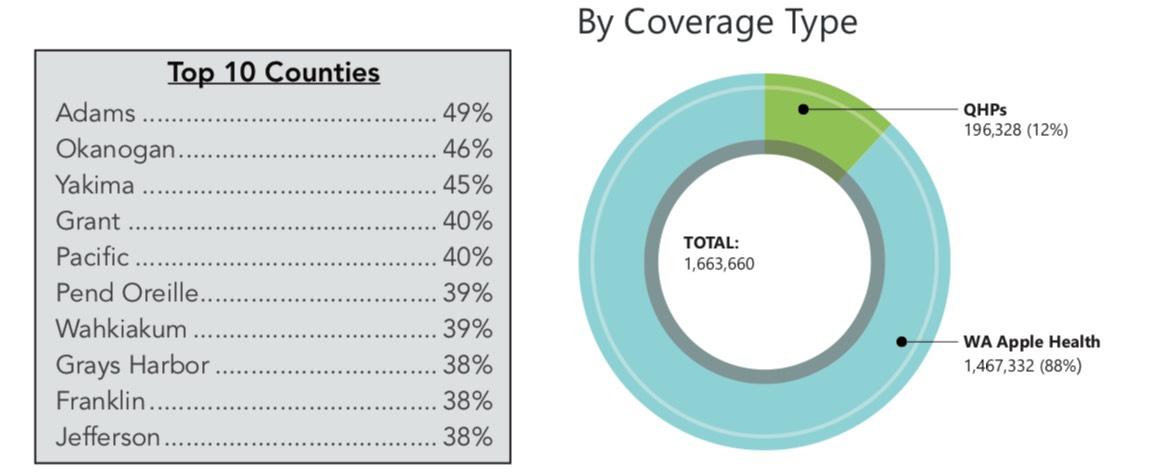 Nearly 200,000 customers used the state’s online marketplace to purchase a Qualified Health Plan (QHP) for coverage this year, adding to the more than 1.4 million residents who connected with free or low-cost health insurance through Washington Apple Health. In several rural counties (Adams, Grant, Okanogan, Pacific and Yakima), nearly half of the population relied on Washington Healthplanfinder to enroll in a 2019 health insurance plan.