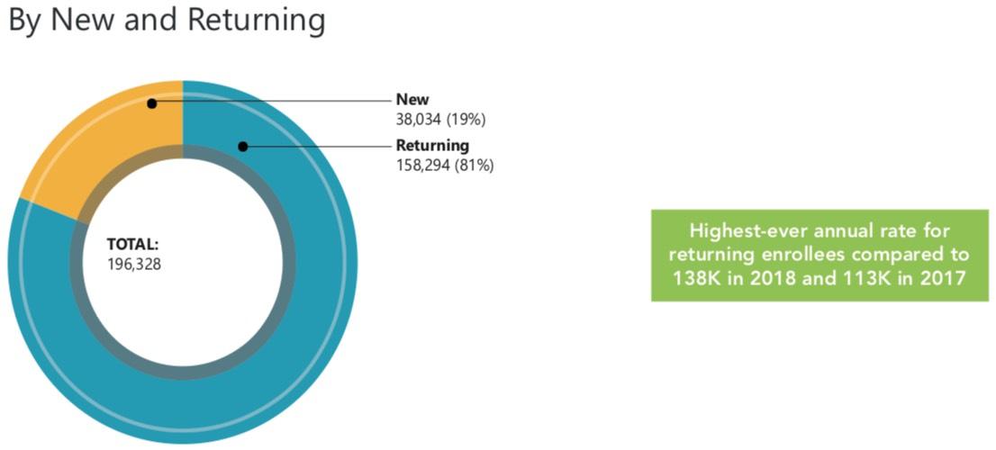 ...A key takeaway also included in the report is that a record high number of QHP enrollees are returning customers. Over 80% of total QHP customers in 2019 also purchased coverage through Washington Healthplanfinder in 2018.