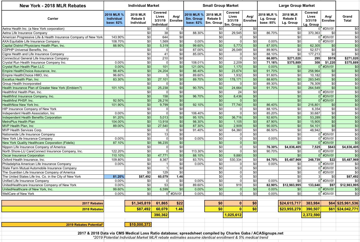 AGAIN: There's absolutely no guarantee that things will play out this way. It's possible that none of these carriers will make MLR payments next year, or only some of them will, or the amounts will be smaller. These 2019 projections are pure speculation on my part based on a number of big assumptions.