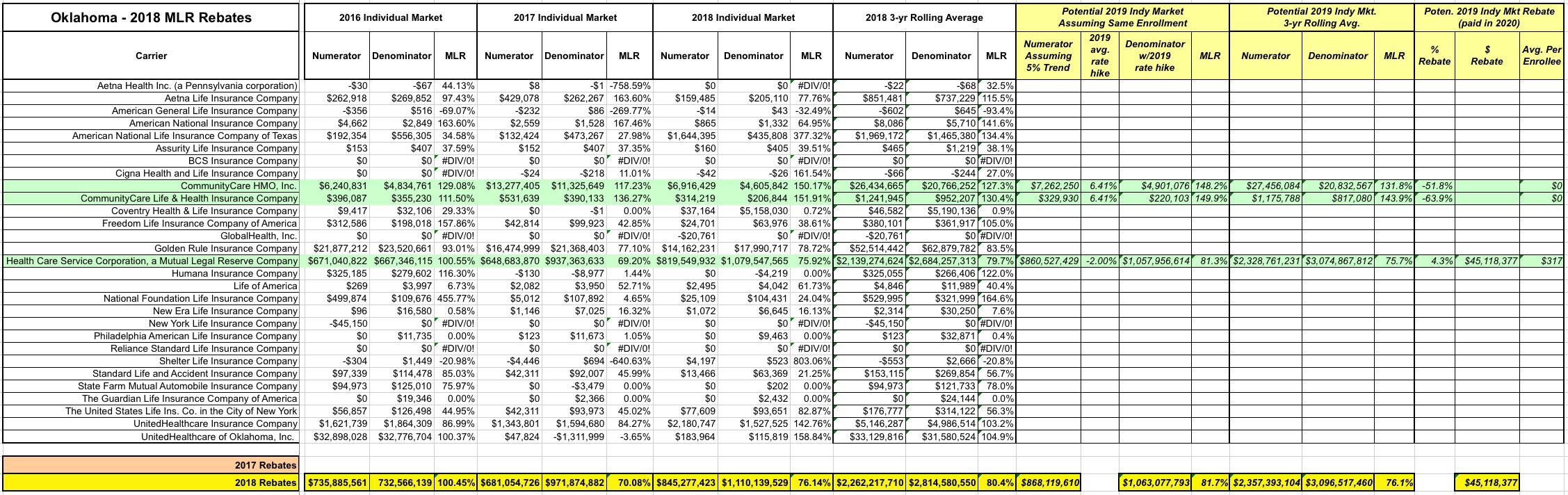 NEXT year, however, there could potentially be a massive Indy Market rebate...again, courtesy of Blue Cross Blue Shield of OK. They ran a horrible 100.6% MLR in 2016, but that's dropping off the formula next year, so they'll be looking at 2017's disturbingly low 69.2% and 2018's still-low 75.9%. With only a 2% average rate drop for 2019, their 3-year rolling average could come in at under 76%, which would result in up to a whopping $45 million in rebates being paid out to enrollees.