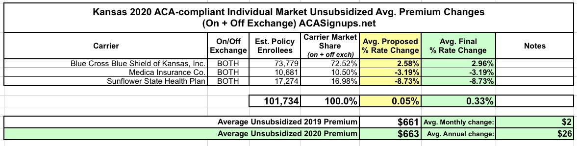 I didn't have the actual enrollment data for the individual carriers when I ran the numbers for Kansas in August, so I had to go with an unweighted average unsubsidized 2020 premium rate change. At the time, that came in at a 3.1% reduction.