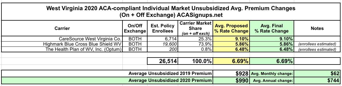 West Virginia: *Final* avg. 2020 #ACA premiums: 6.7% increase...for the highest premiums in the country