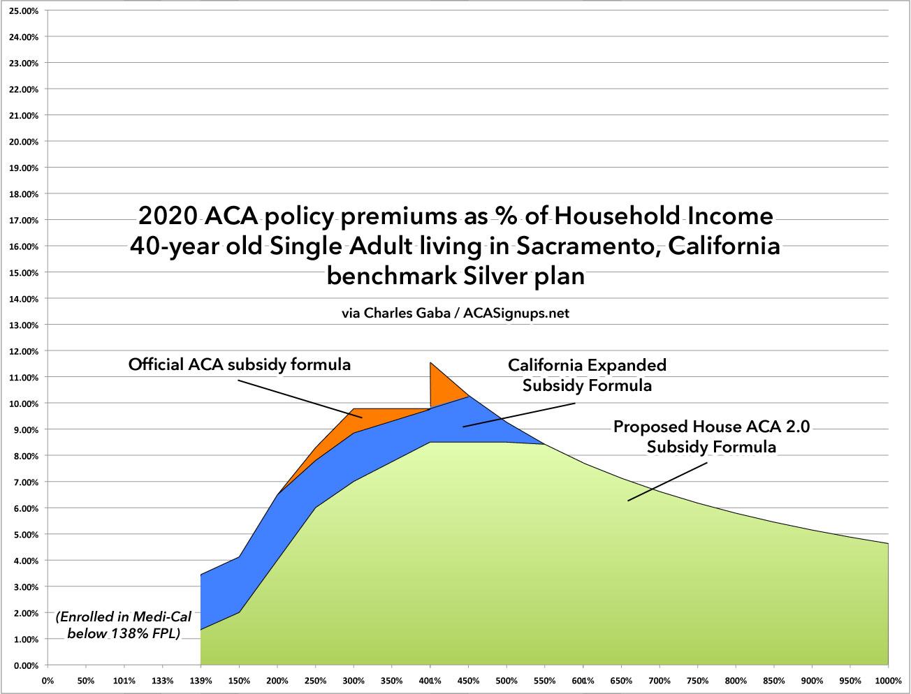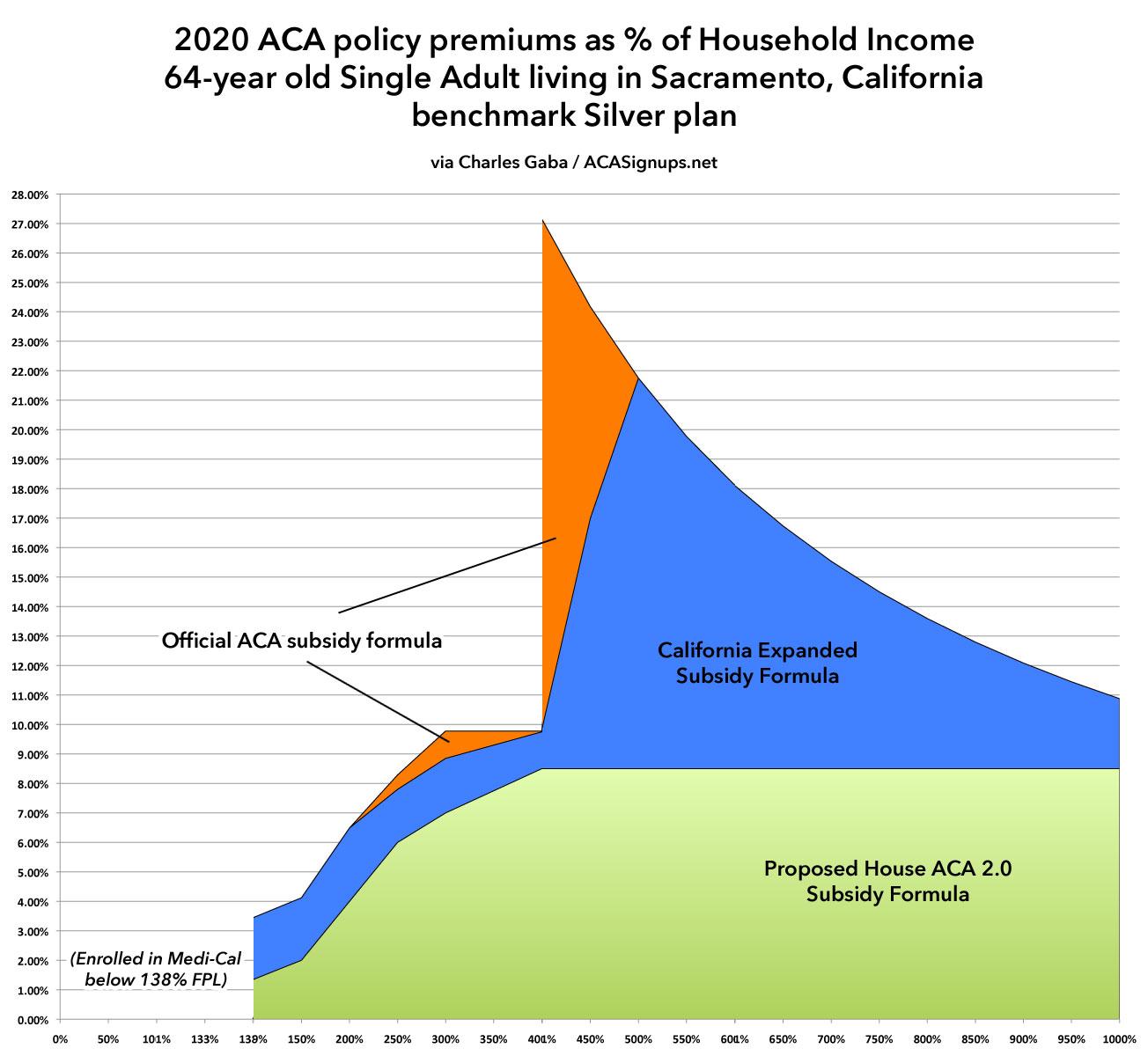 Under the official ACA structure, the total cost for both would be limited to no more than between $68 and $551/month between 138 - 400% FPL...after which it would immediately jump to the full $717/mo, or over $8,600/year. Under California's expanded subsidies, however, they'd receive additional savings of as much as $472/year between 250 - 400% FPL...and as much as $1,891 between 400-450%.