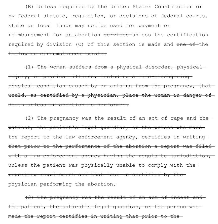 First of all, there's the whole "banning abortion coverage from private insurance" bit, which goes way beyond the Hyde Amendment or any state-level equivalent. This is private insurance, not taxpayer funded health coverage. This basically amounts to forcing women to take out Rape Insurance, which is...actually similar to something Michigan Republicans did in 2014. And no, the bill in question, HB 182, does not include exceptions for rape or incest...in fact, it looks like it removes existing exceptions: