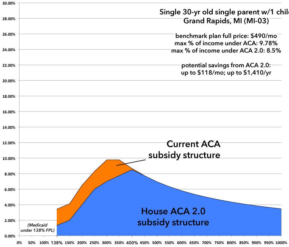 In Michigan, children qualify for Medicaid/CHIP up to 200% FPL, so the official premium for the parent only would only be $292 up through that point...but once their kid is added on, it jumps to $490/month. Under the current ACA structure, they'd just barely brush up against the subsidy cliff before the full price premium starts to drop off as a percent of income. Under H.R.1868, they'd save up to $1,400/yr.