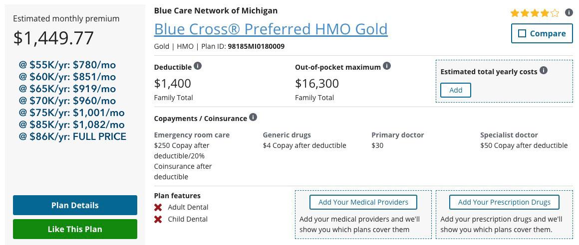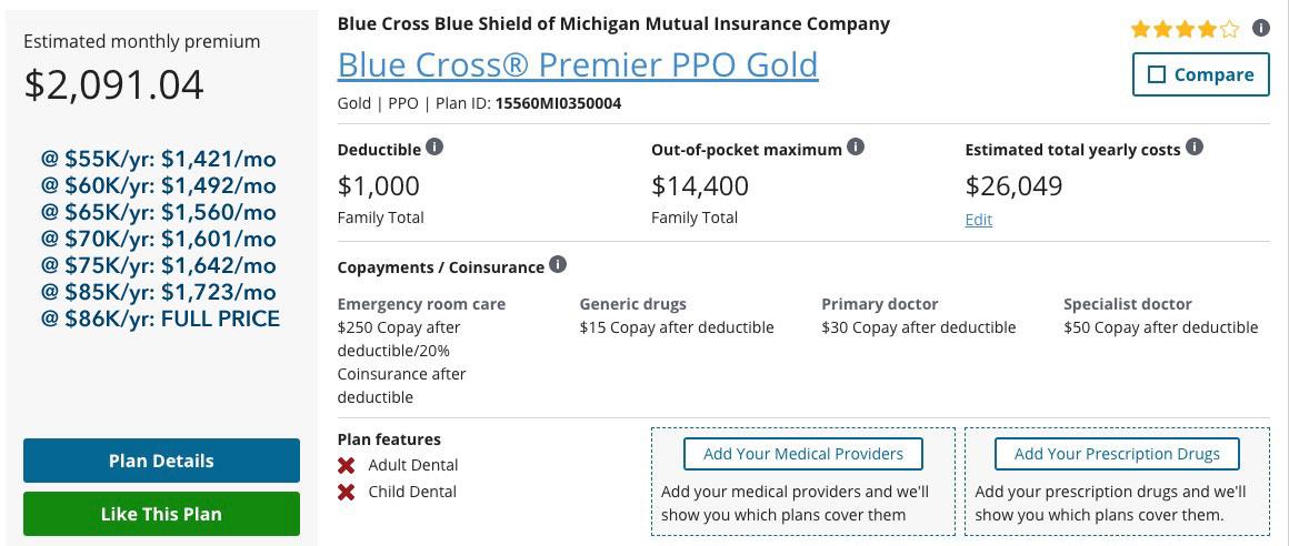 - Unsubsidized ADA Exchange Gold PPO (BCBSM): $2,127/month