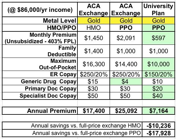 - Unsubsidized ACA Exchange Gold HMO (BCN): $1,486/month