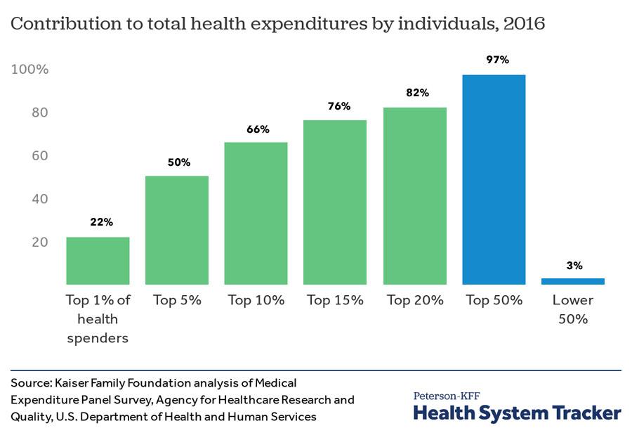 As you can see, just 1% of the population racks up a whopping 22% of all healthcare spending nationally. 5% of the population eats up fully 50% of all spending, and 50% of the population is responsible for 97% of it. This means the remaining 50%--fully half the entire population--only imposes 3% of all healthcare spending nationally.