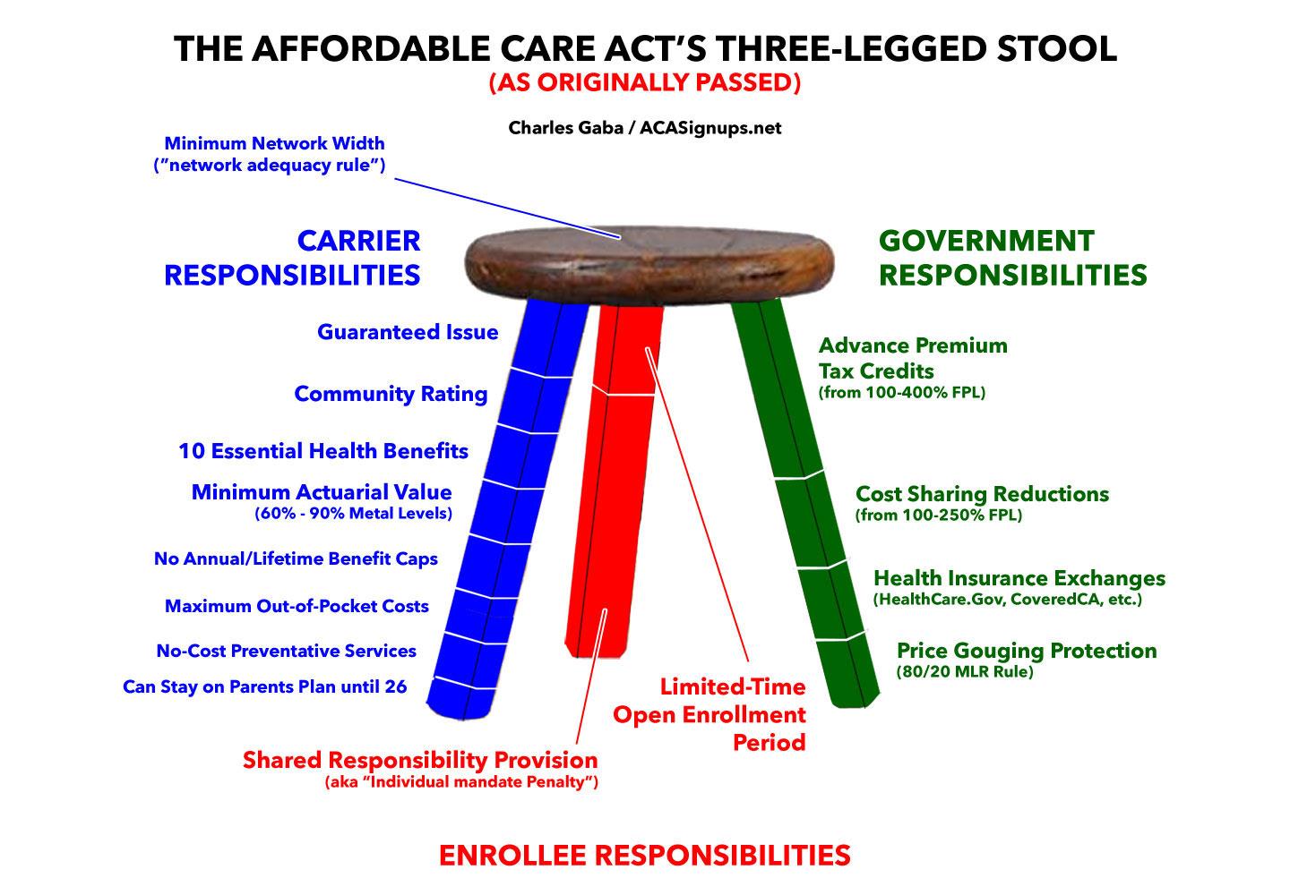 So what happens if the Texas vs. Azar lawsuit is ultimately successful? Well, it's possible that the only thing which will happen is the underlying individual mandate penalty is struck from the law, in which case the rest of the ACA would continue to chug along as is. It's also conceivable that only the blue leg would be ripped away (i.e., the protections for coverage of pre-existing conditions), leaving the rest of the stool intact.