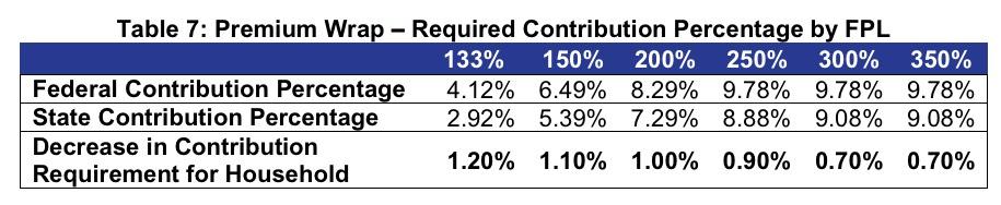 • The premium wrap would decrease the required contribution of income between 0.7 and 1.2 percentage points for enrollees below 400% of the federal poverty level (FPL). The cost-sharing wrap will reduce expenses through lower deductibles, copays, and/or coinsurance rates for on-Exchange Silver plan enrollees between 200% and 400% FPL. This would be achieved through a new CSR plan for enrollees between 200%-249% FPL with a 77% actuarial value (members currently eligible for 73% AV CSR plan) and expanding eligibility for the 73% AV CSR plan to members between 250%-400% FPL (members currently not eligible for CSRs).