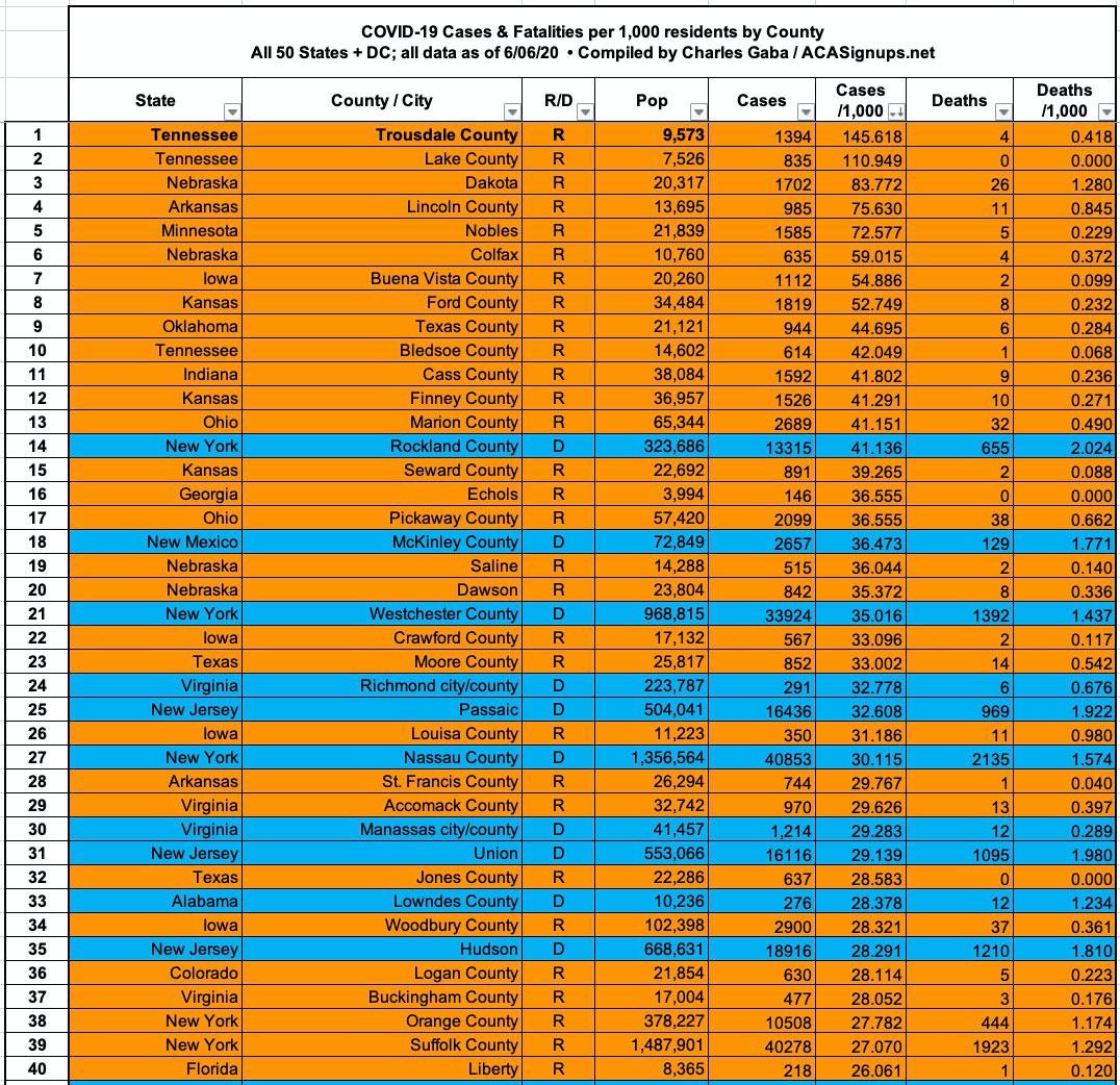 Here's the top 40 counties ranked by per capita COVID-19 cases as of Saturday, June 6th: