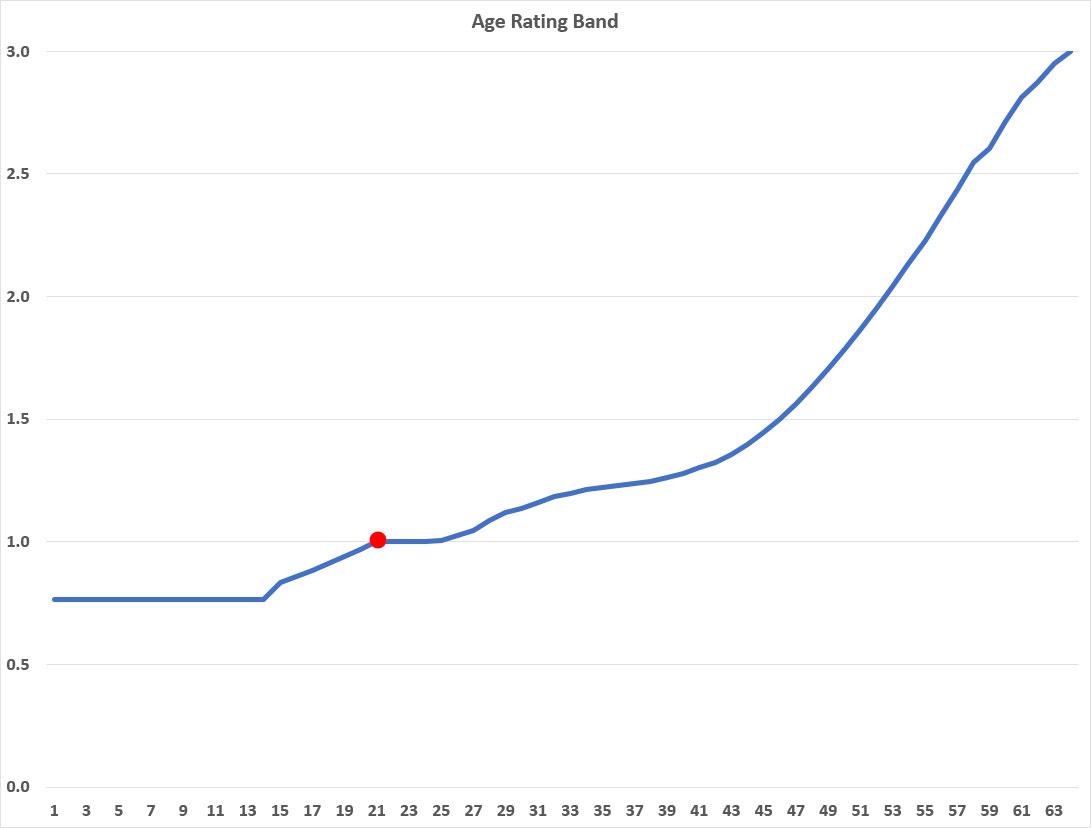 Here's what the standard 3:1 age rating band looks like. Notice that it's not a simple straight line from 1x to 3x; the ratio stays flat for children up to 14 years old, and from 15 until around 44 years old it increases at a fairly nominal rate; a 44-year old is still only paying around 40% more than a 21-year old. Once you hit around 45 years old, however, the line curves sharply upwards: