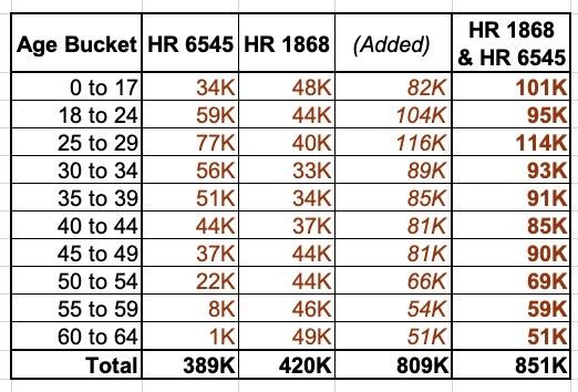 Notice that the Underwood bill (HR 1868) is projected to drive up enrollment more for children and those over 45 years old, while the Age Adjustment bill would drive enrollment more for those age 18 - 45...which makes sense when you remember how much the slope of the age band curve bends starting at right around 45. Also notice that the enrollment increase from passing both bills isn't simply a matter of adding the two numbers together...it'd actually be even higher than that: