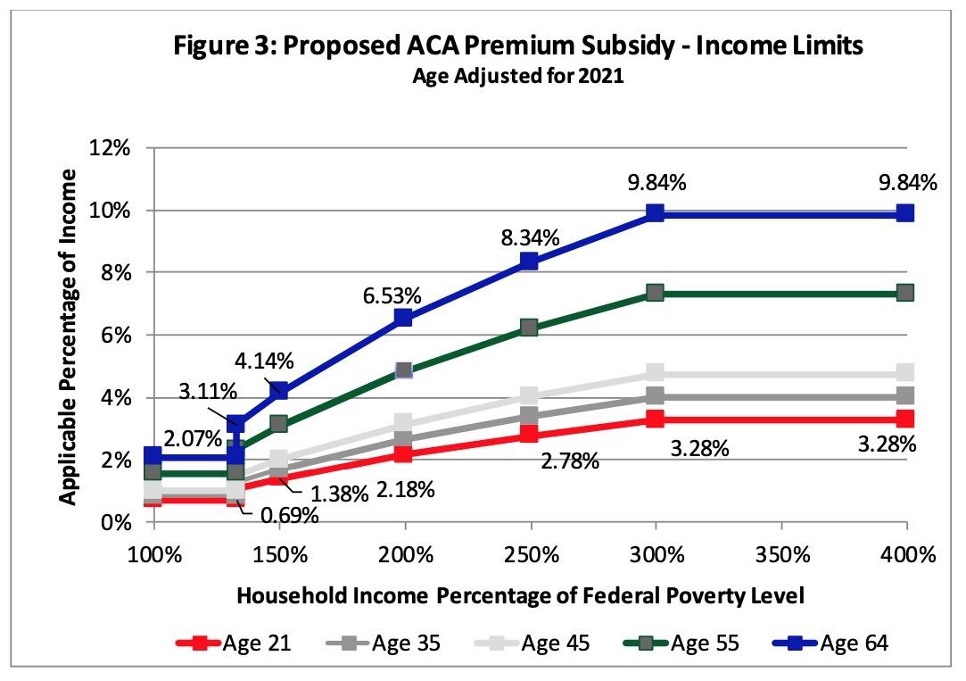 At age 64, it would follow the exact current ACA APTC subsidy formula. A 55-year old, however, would be capped at around 7.8% of income; a 45-year old at around 4.7%, a 35-year old at 4% and a 21-year old at just 3.3% of their income for a benchmark Silver plan (exactly 1/3 of the maximum cap for the 64-year old).