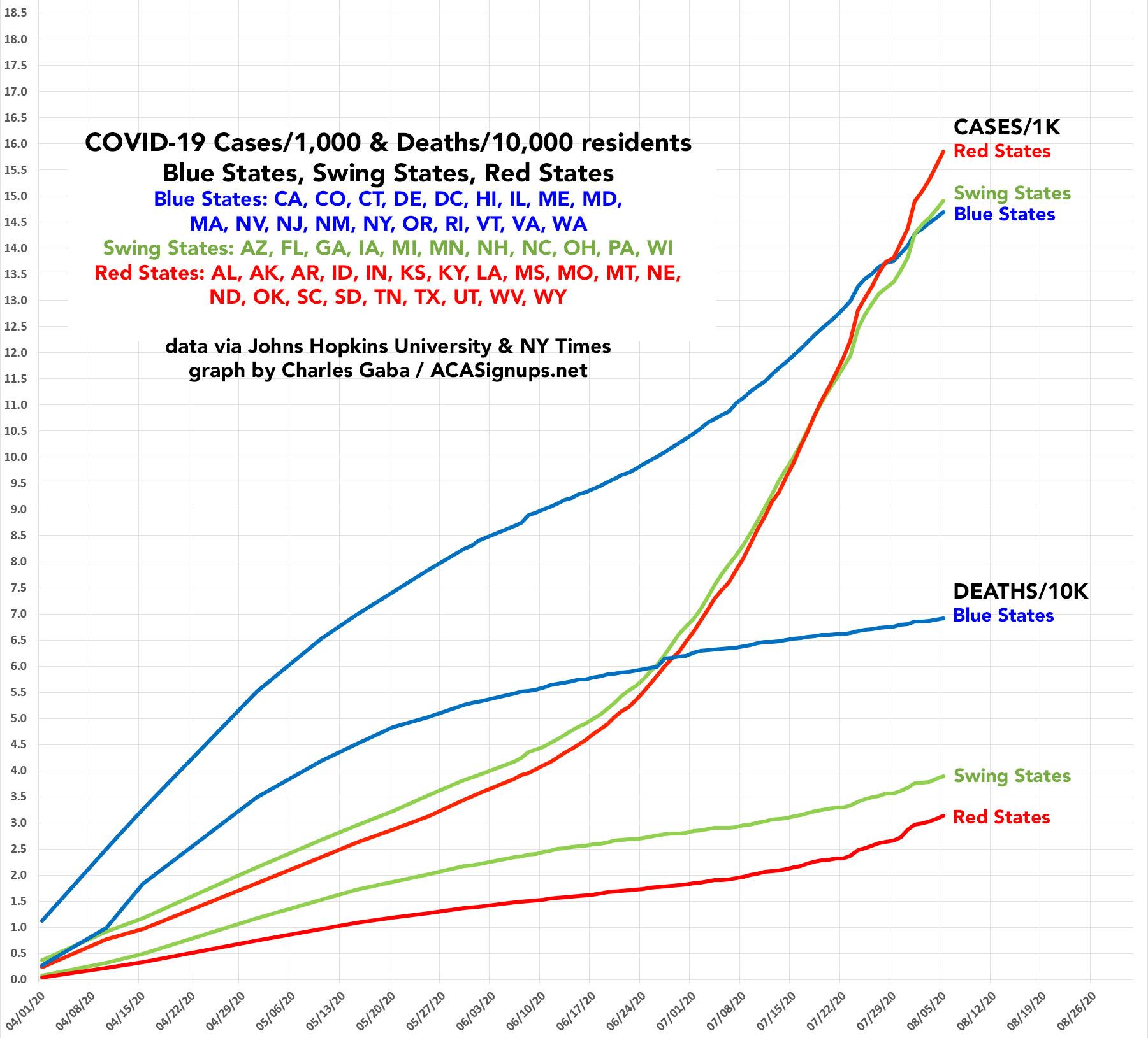 With this in mind, I've been tracking the spread of the virus across every state on a daily per capita basis, both in cases per 1,000 residents and deaths per 10,000 (I use the different scales to make it easier to see the trendlines of each on the same graph). Here's where things stand as of today, with all 50 states + DC grouped into Blue States, Red States and Swing States. The definition of "Swing State" is a bit arbitrary; I've picked the nine which have been traditionally considered to fall into that category, along with Arizona and Georgia, the "new sun belt" swing states: