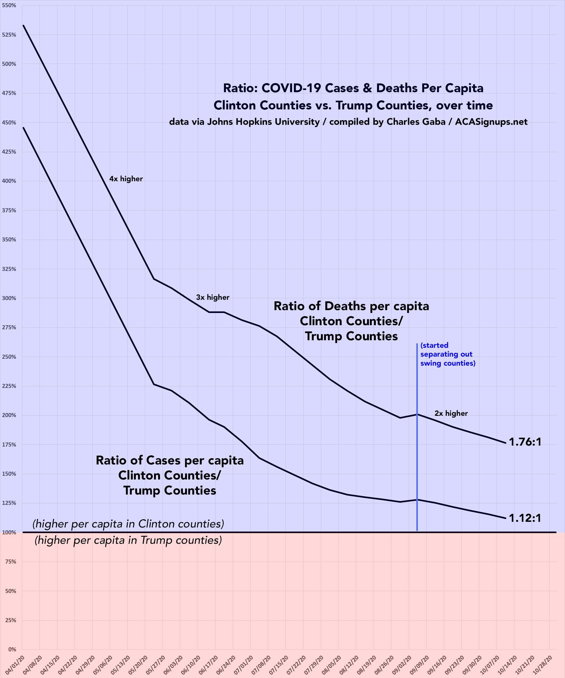 As you can see below, separating out the ~200 swing counties from the Red and Blue ones caused the ratio between the two for both case rates and death rates to bump back up towards a higher blue county rate, but only slightly and only for that one week. The trend has continued downwards since then: