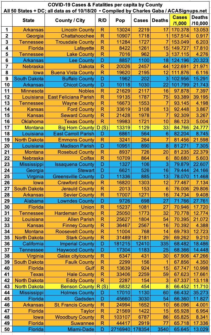 Here's the top 100 counties ranked by per capita COVID-19 fatalities as of Saturday, October 10th (click image for high-res version):