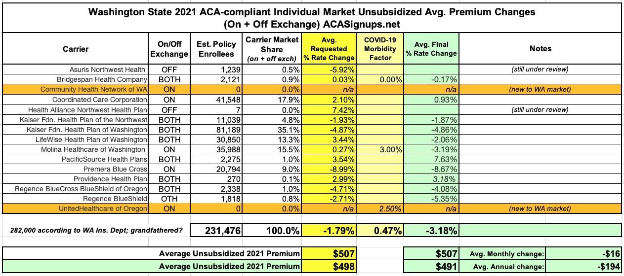 Washington State: *Approved* avg. 2021 #ACA premiums: -3.2%