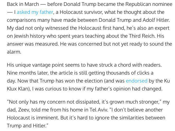 No, because you’re hurling insults at me for pointing out the blatant, obvious parallels between him and the rise of Nazis/Fascism. I just posted like a dozen examples of FUCKING HOLOCAUST SURVIVORS saying flat-out “Yep, Trump is awfully Nazi/Hitler-like”. Now, is it possible that they’re all wrong? Of course. And if so, THANK GOD and I’ll be very happy to wear that egg on my face. But there’s AMPLE REASON for intelligent people who aren’t prone toward hyperbole to see the parallels, & you’re ignoring that.