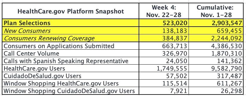 In Week Four of the 2021 Open Enrollment period, 523,020 people selected plans using the HealthCare.gov platform. As in past years, enrollment weeks are measured Sunday through Saturday.