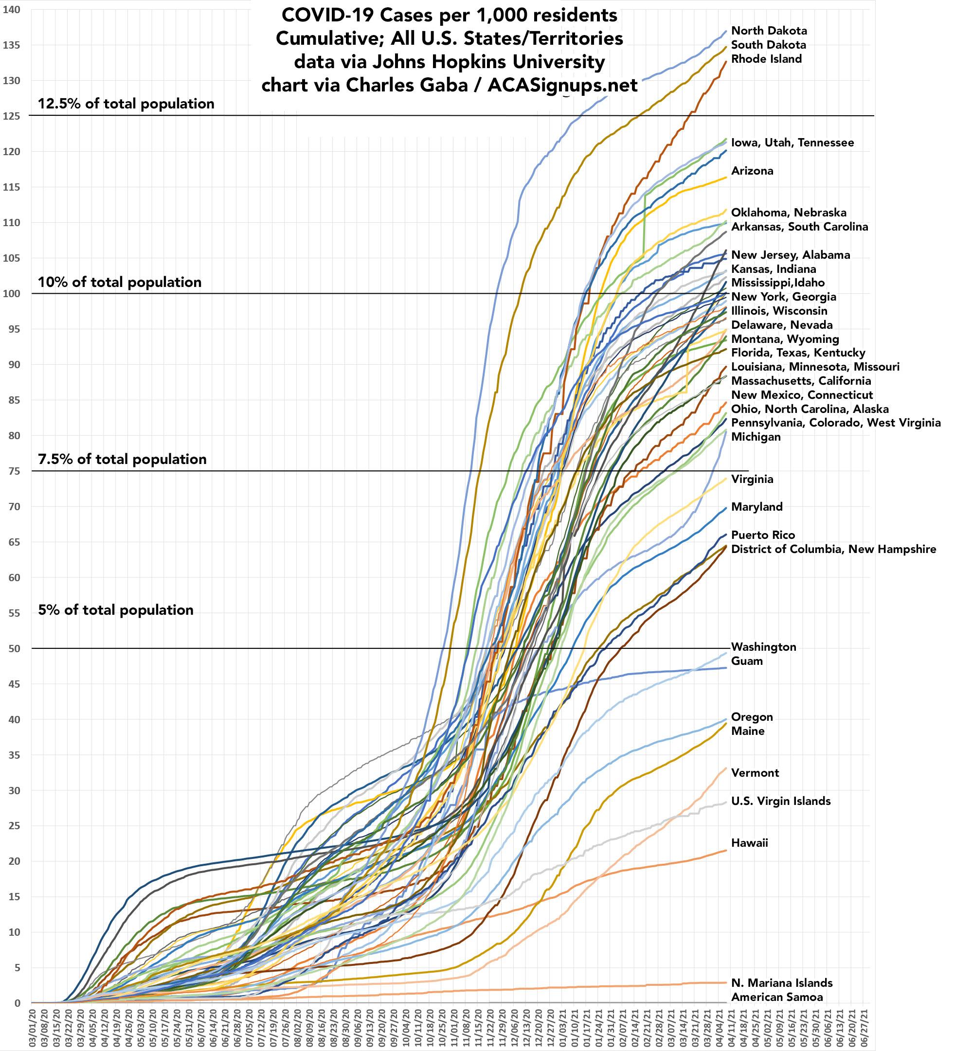 More than 1 out of every 8 residents of North Dakota, South Dakota and Rhode Island have tested positive for COVID-19 over the past year.