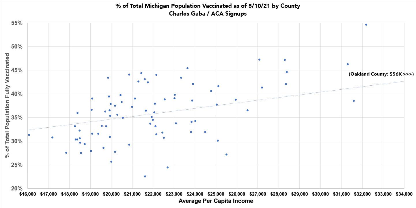 UPDATE: As Jennifer Taub and Thomas Richardson have suggested, I've also run scatter plots for Michigan counties by average per capita income and by eduation (percent of population with at least an associates degree). Both also show similar trend lines (I'm not showing Oakland County on the income graph as it's a huge outlier which skews the graph pretty badly).