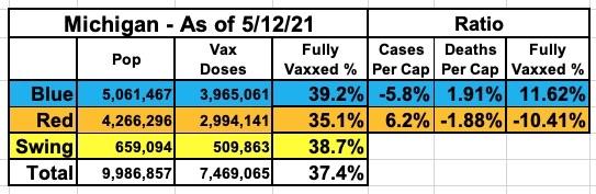 ...On the vaccine front, meanwhile...yep, as of today, Michigan's handful of large Blue counties (the 12 counties which voted for Biden last fall have 55% of the population) have vaccinated 36.2% of their residents, while the other 71 Trump-voting counties have only vaccinated 32.9% of theirs.