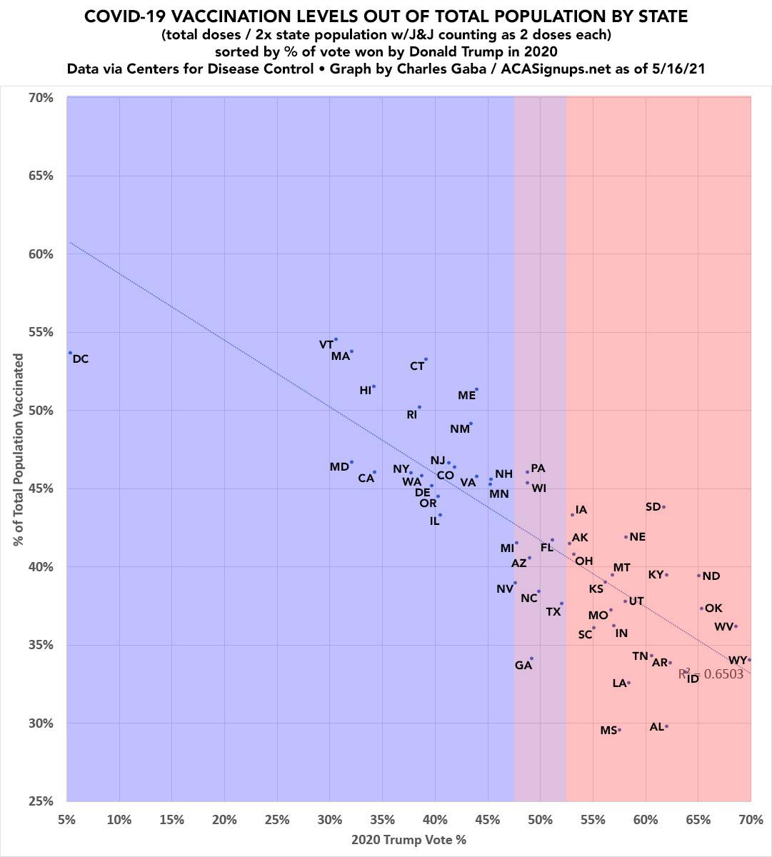 So over the weekend, I posted a simple scatter plot graph which displayed the current COVID-19 vaccination rates across all 50 states +DC according to what percent of the 2020 Presidential vote was won by Donald Trump.
