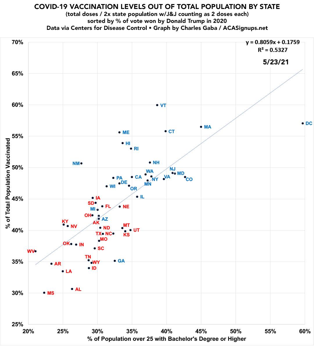 I've added another version which plots out each state by Educational Attainment (% of population over age 25 w/a Bachelor's Degree or higher, according to the U.S. Census Bureau). As you can see, there's also a strong correlation here, but not as strong as by partisan lean: