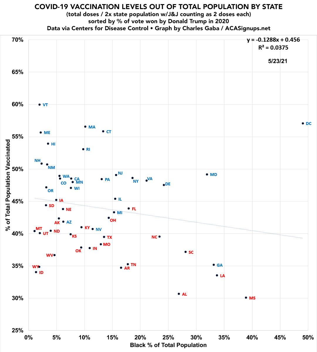 I've also plugged in a RACIAL DEMOGRAPHIC version based on the percent of each state's popualtion which is Black, according to 2018 Census Bureau estimates (by way of BlackDemographics.com). Obviously there's also Hispanic, Native American, Asian American/Pacific Islanders etc, but this illustrates things the most clearly: