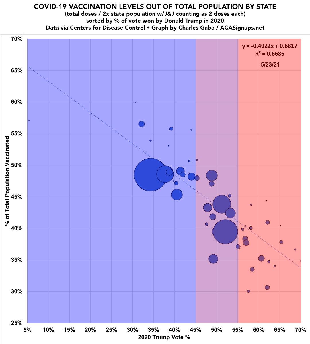 The vaccination levels for each state below are based on taking the total number of COVID-19 doses administered to date according to the Centers for Disease Control), then and dividing that into double the state population (since each person needs two doses to be fully vaccinated) as of April 2020 according to the U.S. Census Bureau.