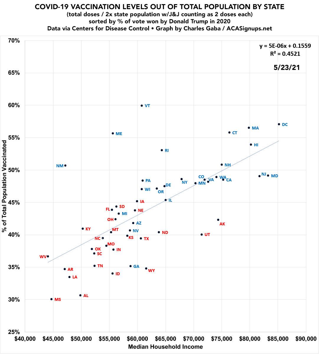 I've also plotted it out by Median Household Income (as of 2018, via the American Community Survey). Again, a definite correlation but not as strong as when ranked by partisan lean.