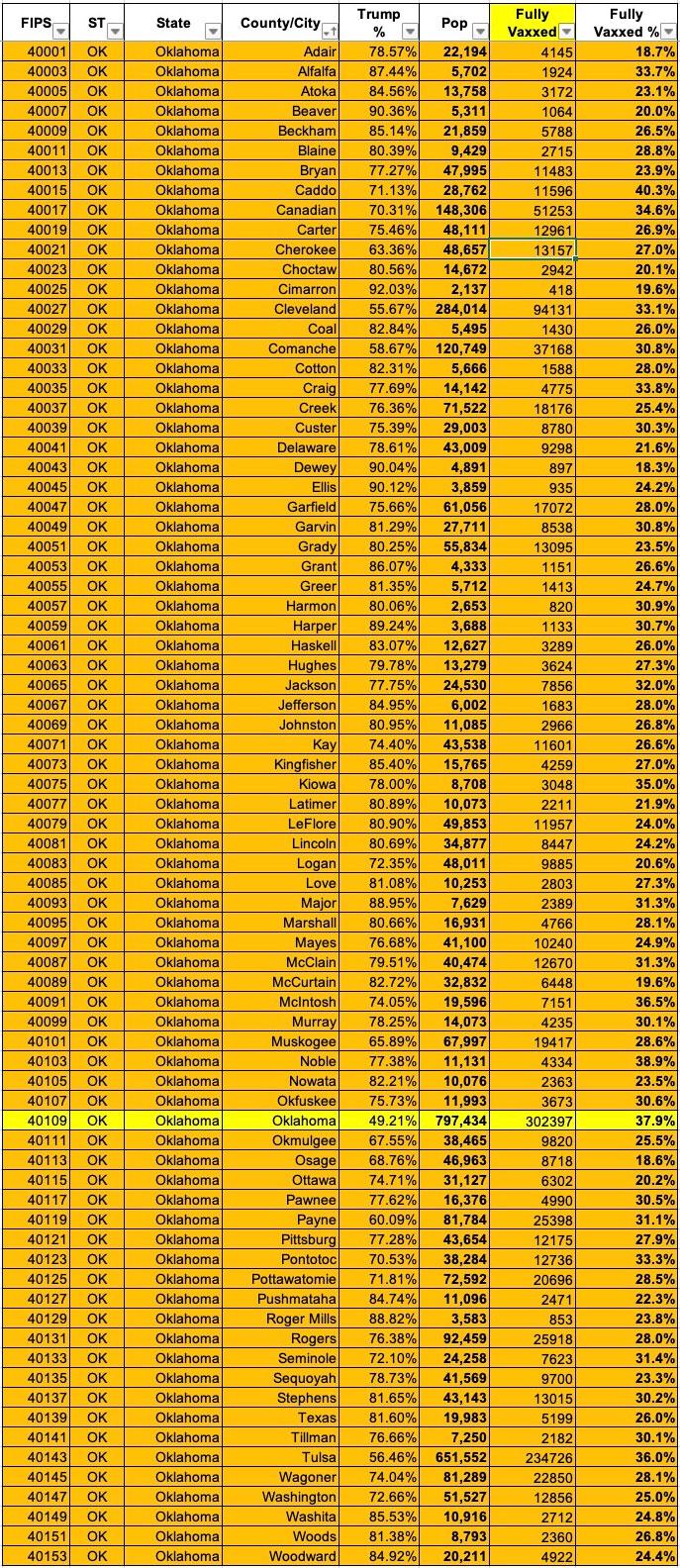 NOTE: The CDC lists ~91,000 Oklahoma residents (7.3% of the total fully vaccinated) whose county of residence is unknown.