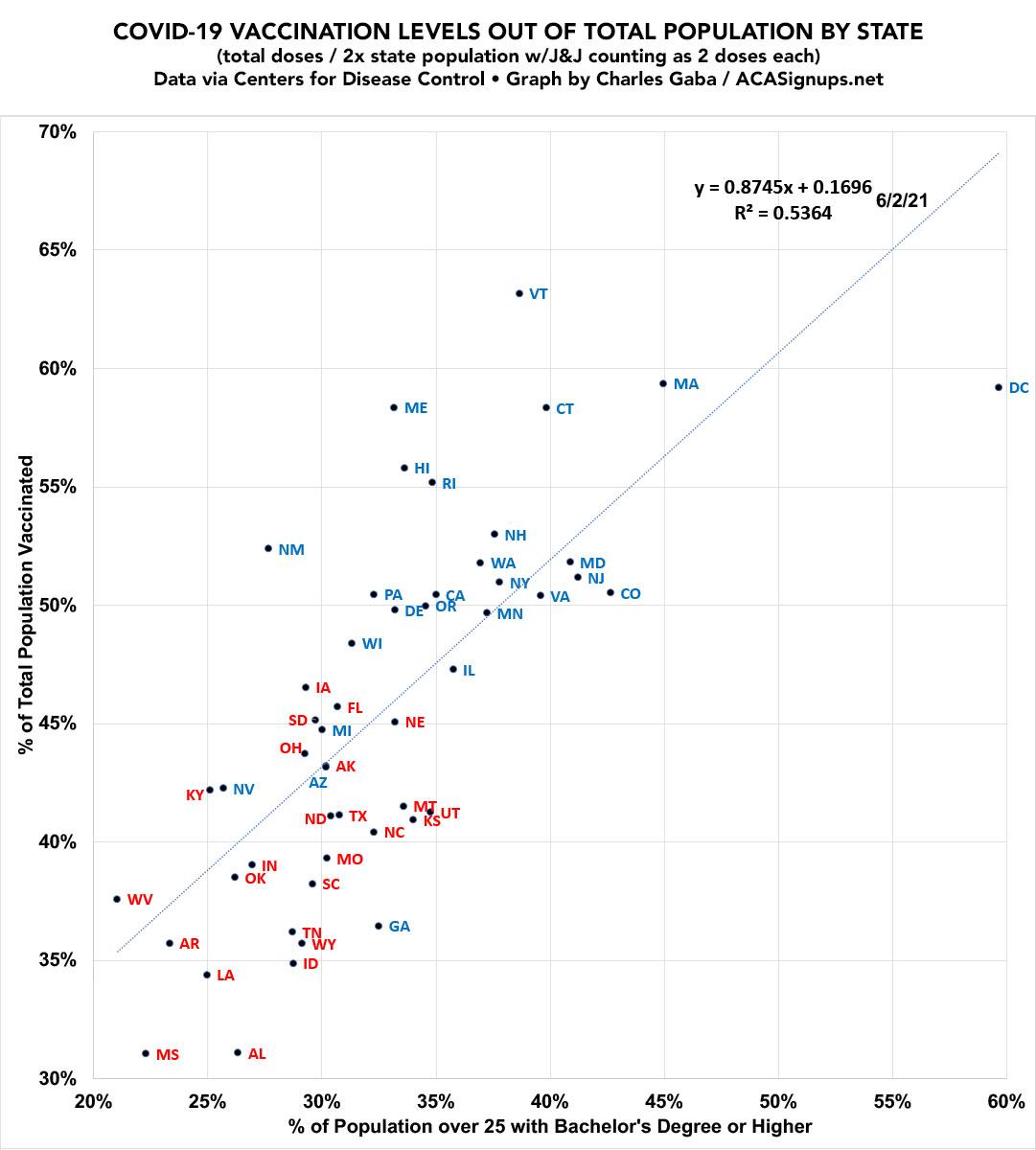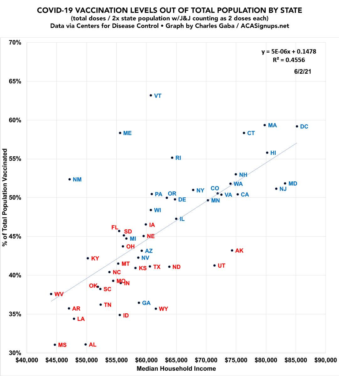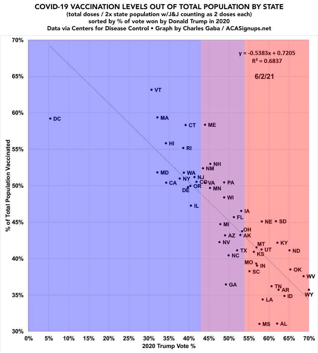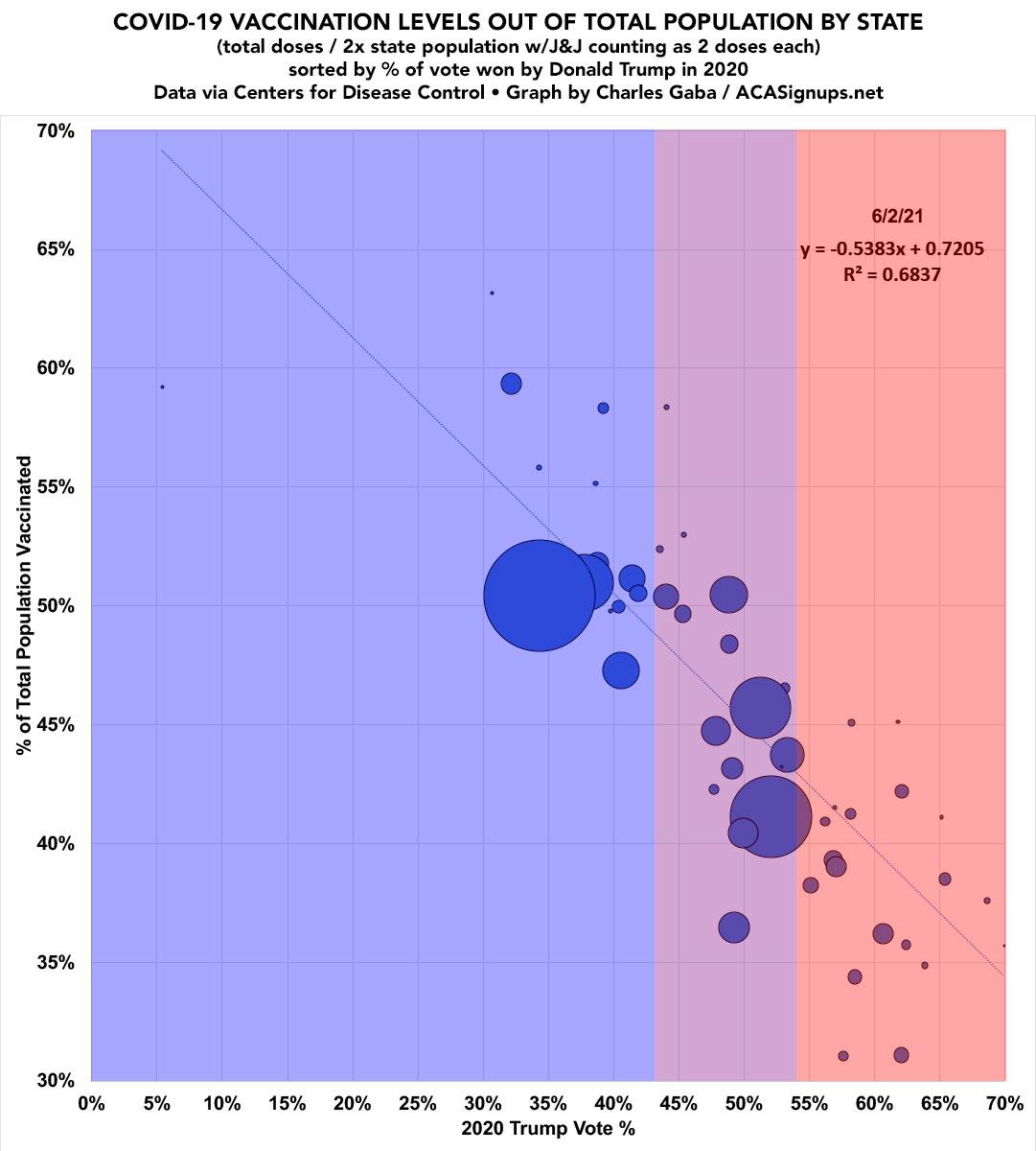 The vaccination levels for each state below are based on taking the total number of COVID-19 doses administered to date according to the Centers for Disease Control), then and dividing that into double the state population (since each person needs two doses to be fully vaccinated) as of April 2020 according to the U.S. Census Bureau.